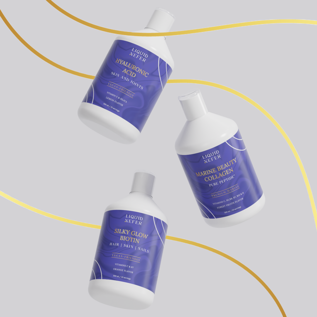 Verbeter uw schoonheidsroutine met het Glow Package van Liquid Nefer, een dynamische combinatie van vloeibaar hyaluronzuur, biotine en viscollageen, ontworpen om uw natuurlijke uitstraling van binnenuit naar voren te brengen.